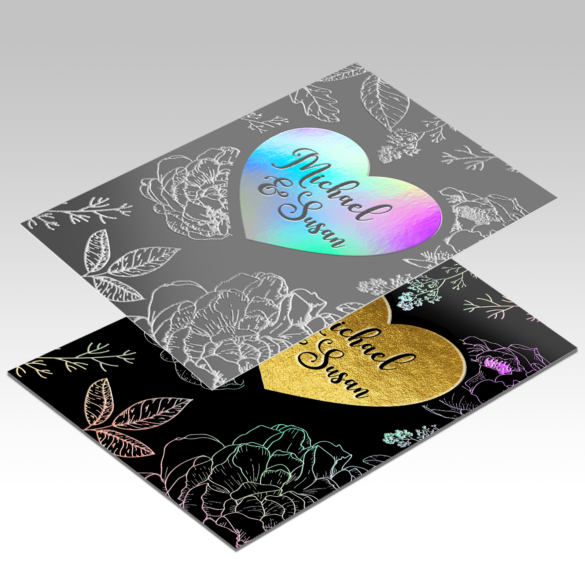Office Graphics’ dual-raised RSVP cards offer an eye-catching visual effect to any business. Dual-raised RSVP cards are printed on 16pt 1.5mil scuff-resistant, soft-velvet suede laminate stock. Unique dual-metallic embellishments bring a level of elegant sophistication to any project.
