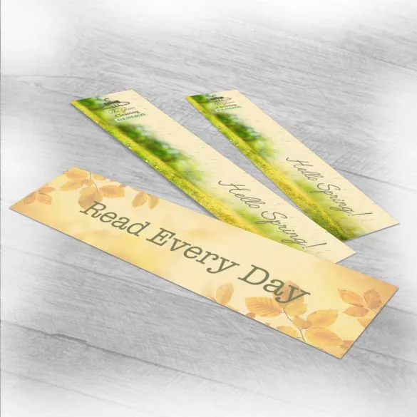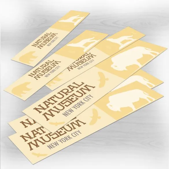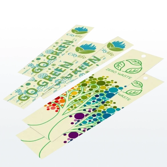 Natural bookmarks are produced using an environmentally friendly 14pt organic stock with 30% recycled post-consumer waste content, giving them a light cream color and smooth finish.